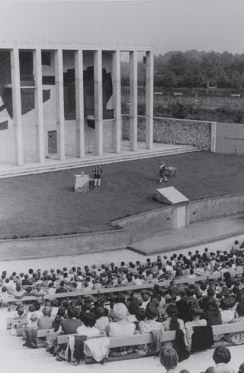 Het regiehuisje verreist hoog boven de trappen en door haar expliciete vorm lijkt het de zwaartekracht te tarten. Het theater is enerzijds tegen een heuvel gebouwd en ligt anderzijds deels onder het maaiveld. Daardoor oogt het openluchttheater van buiten bescheiden. Heden ligt het theater er verwaarloosd bij, de houten banken en poorten zijn verdwenen, en de lichtmasten zijn verroest. Maar de constructie van trappen en muren staat nog overeind, en kan met enig onderhoud weer tot leven gewekt worden.